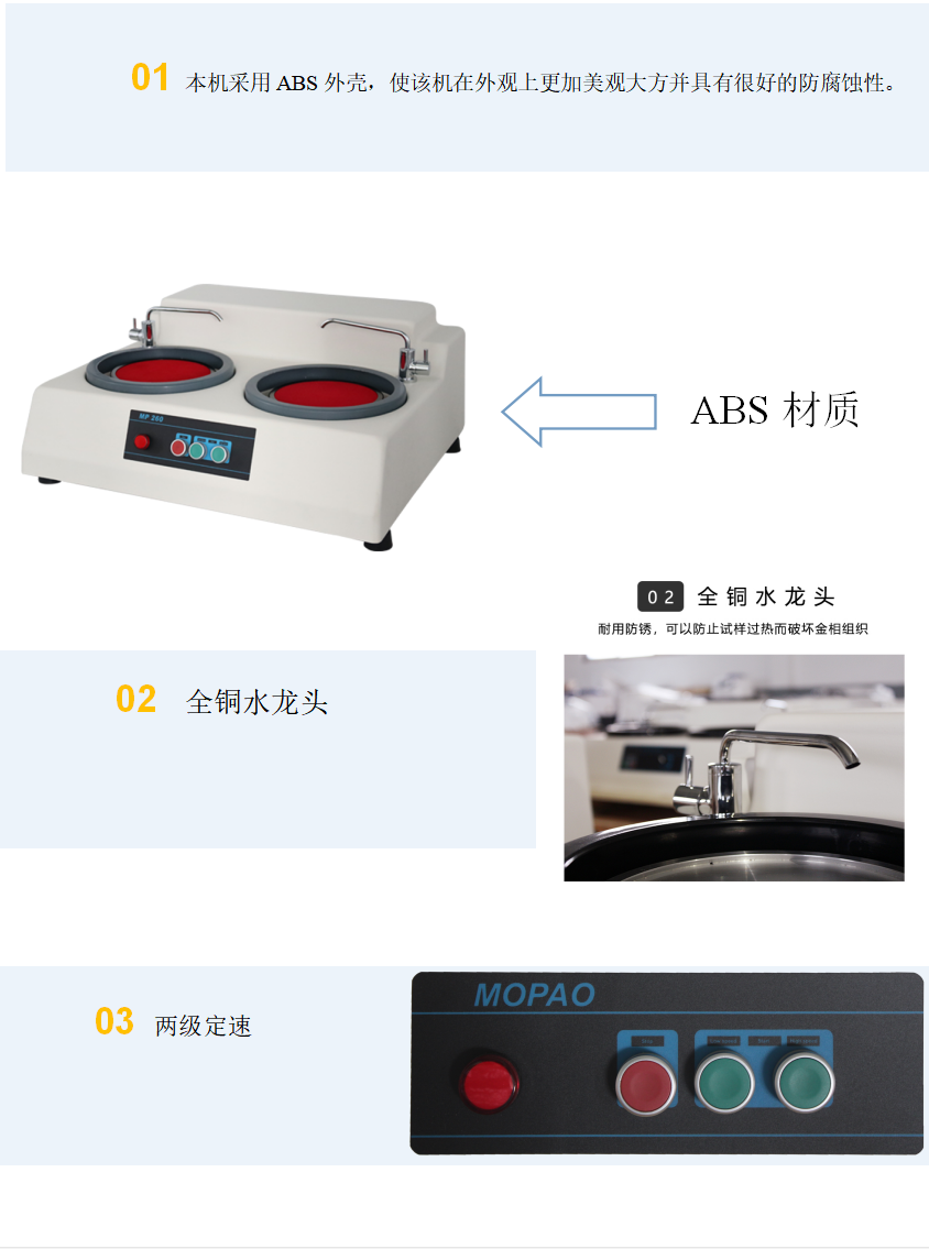 MP-260型磨拋機(jī)為雙盤臺(tái)式機(jī),適用于對(duì)金相試樣進(jìn)行粗磨、精磨和拋光操作。