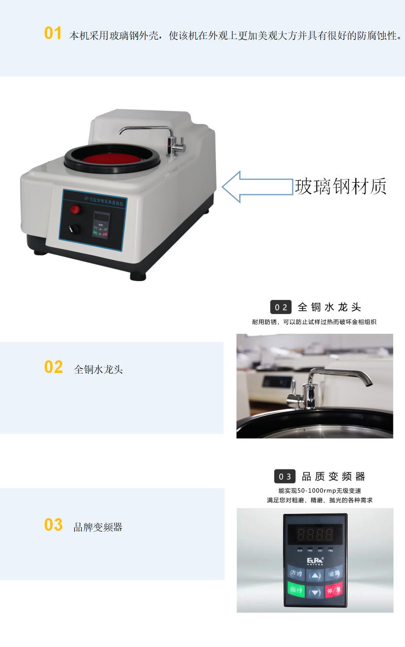 本機(jī)通過變頻器調(diào)速,可直接獲得50-1000轉(zhuǎn)/分鐘之間的轉(zhuǎn)速,從而使本機(jī)具有更加廣泛的應(yīng)用性。是用戶用來制作金相試樣必不可少的設(shè)備。
