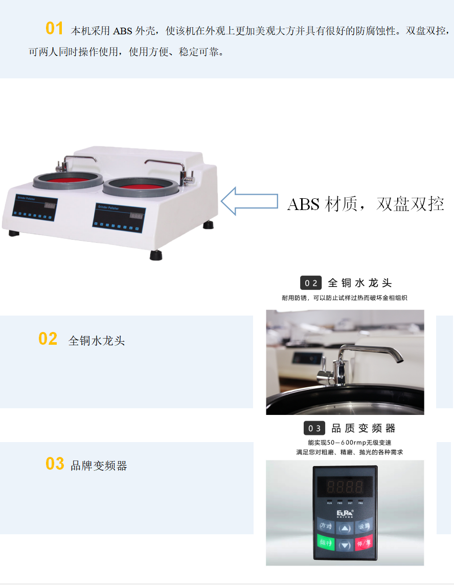 MP-2DE型金相試樣磨拋機(jī)為雙盤(pán)臺(tái)式機(jī),適用于對(duì)金相試樣進(jìn)行粗磨、精磨和拋光操作。