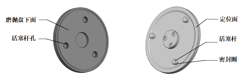 01 磨拋盤可快速更換,兩手拿住磨拋盤輕輕上提即可取下來;將另一個(gè)磨拋盤兩手拿平,目測磨拋盤的三個(gè)活塞桿孔與三個(gè)活塞桿基本對應(yīng)時(shí)落下,感覺其中一個(gè)孔對應(yīng)時(shí),輕微擺動(dòng)磨拋盤使另兩個(gè)也對應(yīng)后將盤持平插入,再用手控壓一下,使磨拋盤下面與磨拋?zhàn)亩ㄎ幻嫱耆佑|。