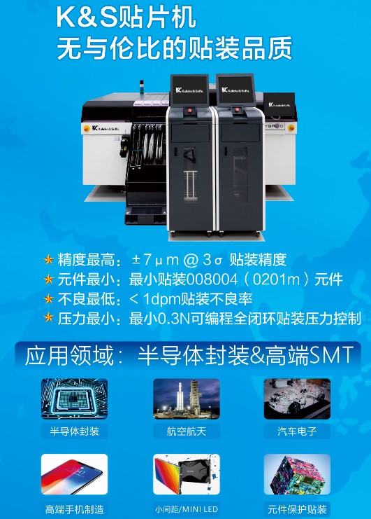 K&S的Hybrid系列貼片機(jī),對(duì)PoP堆疊裝配的技術(shù)和工藝進(jìn)行了進(jìn)行了友好的支持與優(yōu)化。最小0.3N的可編程全閉環(huán)貼裝壓力控制,±7μm@3σ的貼裝精度,以及<1dpm的貼裝不良率,為高直通率提高有力的保障。